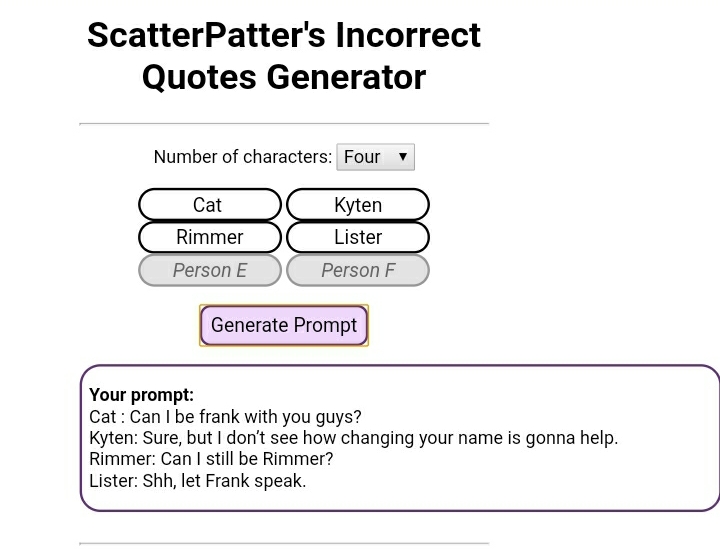 Incorrect quotes characters i was inspired recently by one of my friends to find incorrect quotes using scatterpatter's generator (warning: 1.5m ratings 277k ratings see, that's what the app is perfect for. Reporting on what you care about. #toss #canon #scatterpatters #incorrect #quotes #generator #number #myers #prompt #why #did #give #im #sorry #said #felt #unsafe #now #feel. Some prompts may imply shipping between 2 or more characters. In the future i plan to implement a feature to filter out prompts that involve shipping, but until then i apologize if any. If you change it, the old url will no longer work! Scatterpatter s incorrect quotes generator sonicthehedgehog from preview.redd.it i started creating two generators and they are working fine but they are not working together. We trained our ai on thousands of famous quotations, so it would generate totally new ones. Your mind is beginning to work. In the future i plan to implement a feature to filter out prompts that involve shipping, but until then i apologize if any. I used scatterpatter's incorrect quotes generator, with some mys mes characters! This generator is not meant to imply any adult/minor, abusive, incestuous, or otherwise problematic ships.